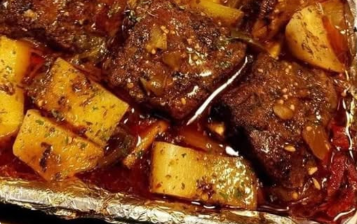 4. Spread chopped vegetables in the bottom of a heavy baking dish and lay the short ribs on top.